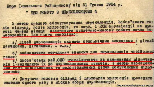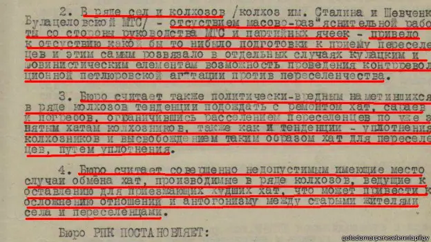"Переселенцы были поставлены в значительно лучшие условия, чем то местное население, что осталось после Голодомора. Люди два года страдали от недоедания, последние 9 месяцев просто умирали от голода. Но им не только не оказывали помощи, их обязывали отремонтировать дома умерших для приезжих. Кроме того, они должны были выделить из выращенного урожая столько зерна, сколько переселенцы оставили у себя в кладовых дома. Даже, согласно документам, обеспечить столами и табуретками".