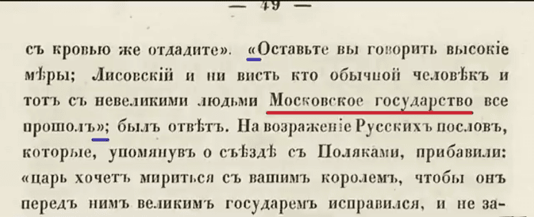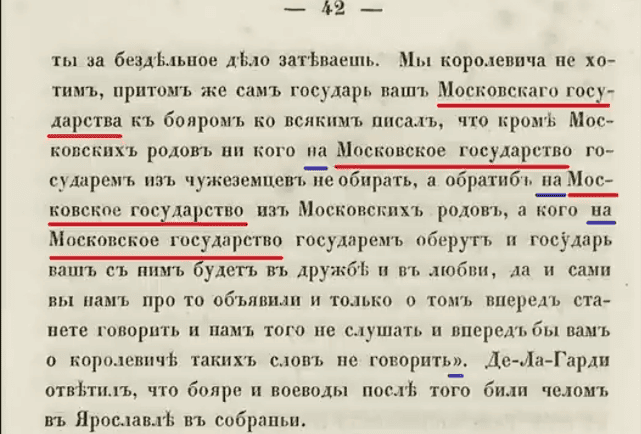 и вот в этой прямой речи, моска\овиты прямо называют свою территорию московским государством. Словосочетание "на Московском государстве",  как вы сами видите, московитый повторяют многожды и они совсем не рассержены на то что швед назвал их на территорию московским государством. Если хотите, они и сами называют свою территорию московским государством московией.  Не на это были рассержены московиты в 1617 году.  И таких документов приведенных в сочинении господина Лыжина вагон и маленькая тележка, которып говорят о том ,что как минимум на 1617 год, московиты того времени знать не зналичто они живут на России, они были представителями Московского государства того времени, которое берёт свои истоки из московского улуса Золотой Орды.