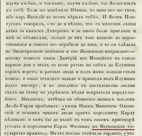 Что же он пишет. Например, на следующей картинке мы можем прочитать такое: господин Лыжин изучил все возможные документы, и в частности он приводит зафиксированные на бумаге споры, где представители разных сторон во время переговоров, автор специально подчеркнул короткими синими линиями открывающиеся кавычки, после которых идет прямая речь, это прямые высказывания которые дословно введены в авторскую речь, то есть, господин Лыжин имел на руках зафиксированные письменно споры между представителями шведского Короля и представителями самозванца Московскогоэто сказано. В своей речи представитель шведского Короля и выдающийся политический деятель де Лагарди называет сопредельную территорию московским государством.