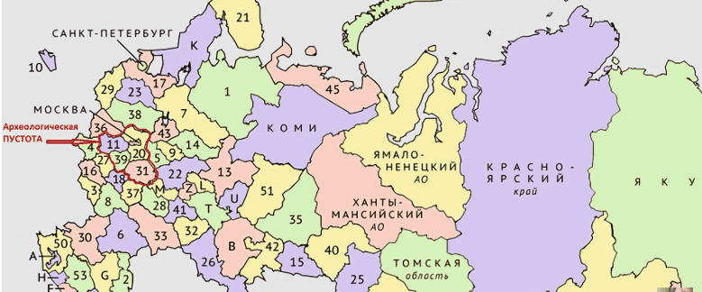 Иными словами, это исторический корень московитской земли. Почему мы рассматриваем эти карты? А рассматриваем мы их только для того, чтобы визуализировать то, что было написано в московитской Википедии относительно истории России. А там, я напомню, былонаписано, что, мол, те были некие славяне, которые переселились на восточно-европейскую равнину в VI- VI веке нашей эры. Но дело-то заключается в том, что согласно самой московитской или даже московской археологии, на вот этой вот указанной территории, территории четырёх областей: Московской, Рязанской, Калужской иТульской, до VI века жили исключительнофино-угорские народы, на которые мы сейчас и укажем.