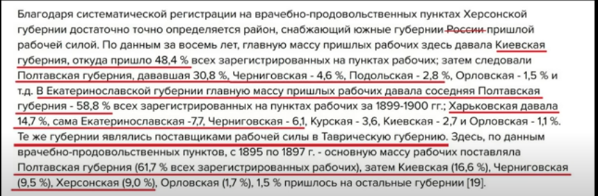 чего следует, что в губернии Херсонской, приблизительно  88%, пришлых рабочих составляли украинцы.  А сколько же было, так называемых, русских? Из Орловской губернии прибыло полтора процента. Все остальные, так называемые русские, были в районе статистической погрешности.