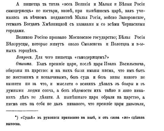 Говоря о принятии Алексеем Михайловичем нового титула «всеа Великия и Малыя и Белыя России самодержец» Котошихин отметил, что это произошло «как учинились в вечном подданстве Малая Россия, войско Запорожское, Великою Россиею прозвано Московское государство, Белая Россия — белорусцы, которые живут около Смоленска и Полотцка и в ынных городех»