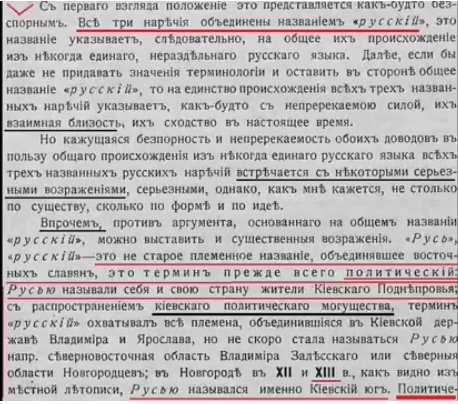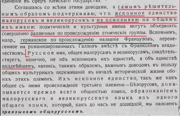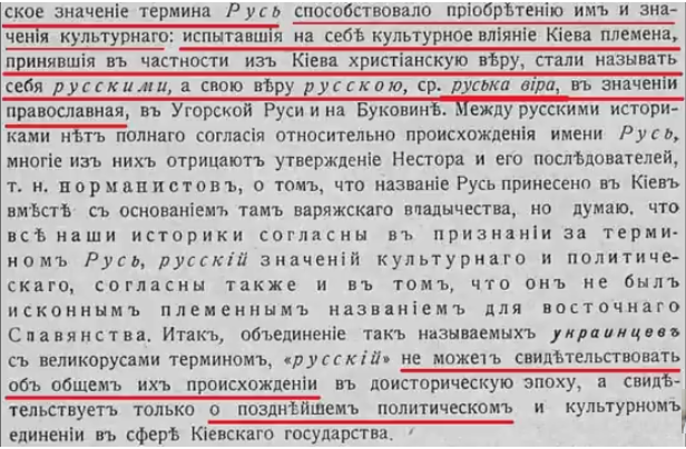 объединение так называемых украинцы с великороссами термина русский не может свидетельствовать об общем их происхождение, а свидетельствует только о политическом и культурном единстве в сфере Киевского государства.